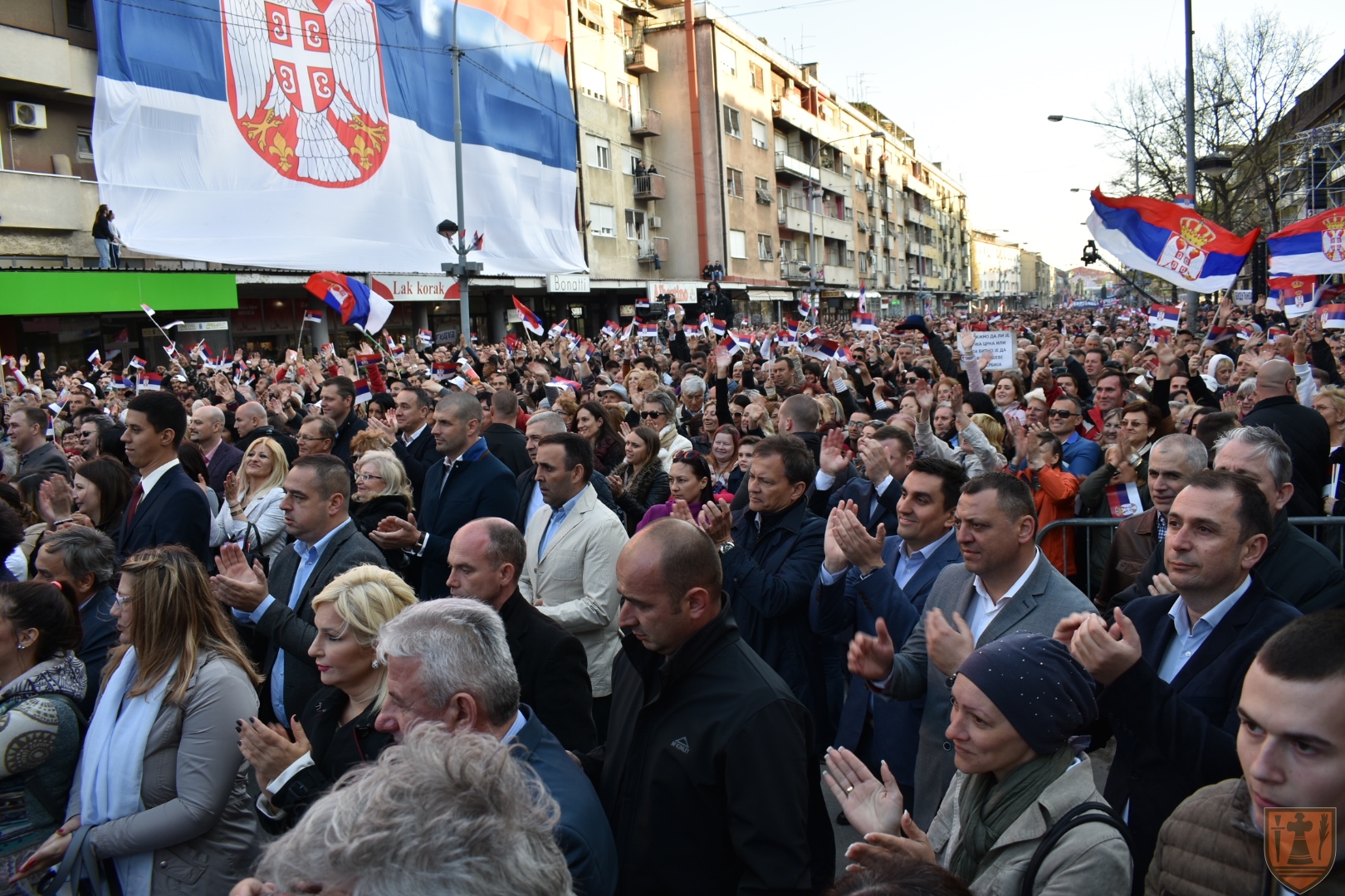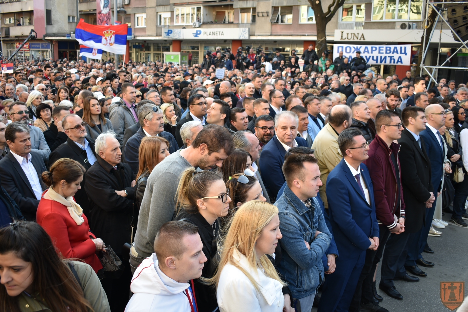 На прве речи Вучићевог обраћања преко целе једне зграде на централном градском тргу развијена је огромна застава Србије. Вучић је тада застао и узвратио да је то дивна застава, као и да га никада у Пожаревцу није сачекао толико велики број људи и да одговорно тврди да ту има више народа него у свим градовима Србије, где се опозиција окупљала заједно, рачунајући и Београд. На скупу у Пожаревцу захвалио се и пензионерима, јер су поднели највећи терет на обнови земље. Напоменуо је да више нема проблема са исплатом пензија, јер је све више запослених, а самим тим има и више доприноса. Вучић је најавио повећање плата и у медицинском сектору, лекарима, медицинским сестрама, наставницима, професорима, учитељима, полицајцима, војницима, социјалном сектору.